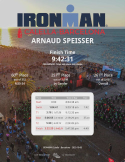 Magnifique exploit d'Arnaud SPEISSER qui a réussi son challenge de descendre sous les 10 heures à l'Ironman de BARCELONE (Espagne) dimanche 5 octobre. BRAVO  ARNAUD !