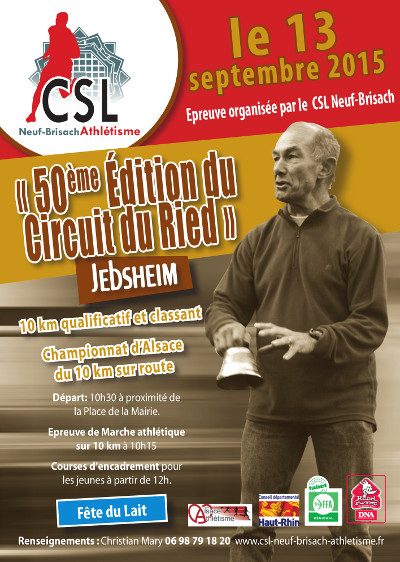 Nous vous donnons rendez-vous le 13 septembre 2015 ! Cette 50ème édition du Circuit pédestre du Ried à Jebsheim fait office de Championnat d'Alsace (*) des 10 km sur route et est qualificative pour les championnats de France de la distance. Un Tee Shirt technique évènementiel sera offert à chaque participant, ainsi que l'entrée gratuite à la fête du lait. Voici des données inédites pour les puristes : le palmarès de toutes les éditions entre 1966 et 2014 (course et marche), ainsi que les records de l'épreuve.